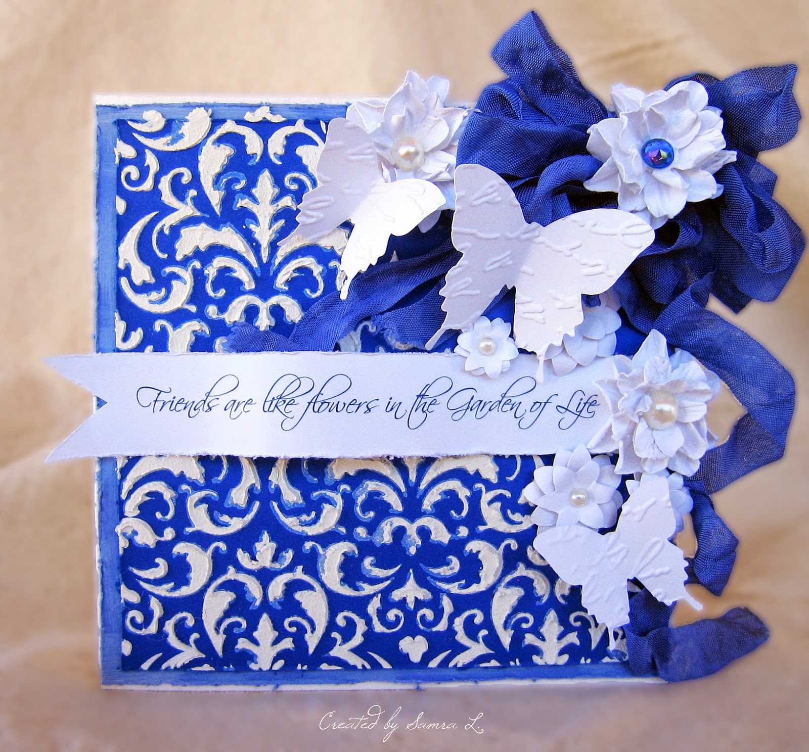 The card base is white, topped with light blue piece of distressed edges cardstock. I also used distress white paint on the edges of that piece. I used dark blue cardstock for my top layer. I distressed edges and then I used texture paste and Damask stencil to create the damask design on it. You can find amazing tutorial on different types of texture paste on this blog: http://mylittlecraftthings.blogspot.com This young lady makes amazing cards!