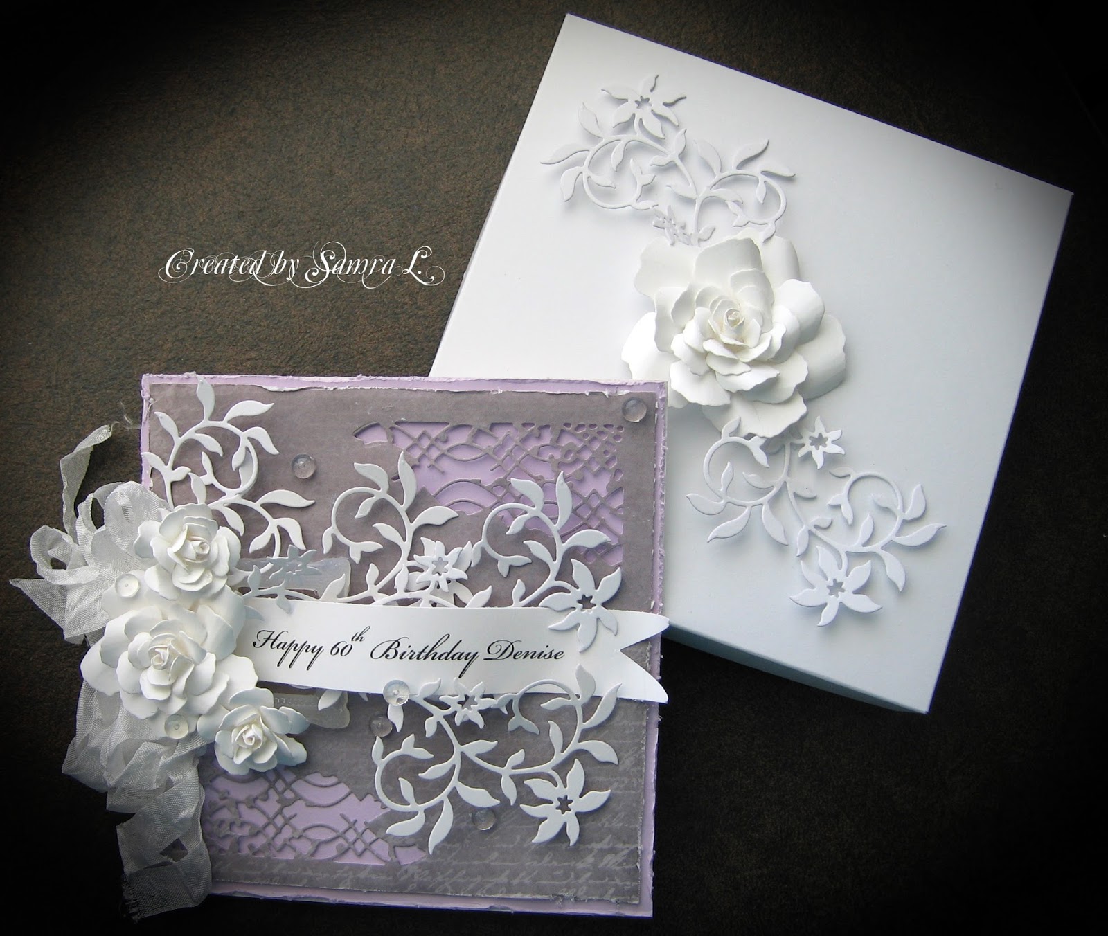 Oh my gosh, Samra, this is spectacular!! I absolutely love the design and the flourishes (adding them to my must-have list)!! Your flowers are perfection, as always!! The colors are beautiful!! I love, love this, my friend!! It's so elegant and gorgeous!! The box, too!! Have a great day!! Big hugs :)